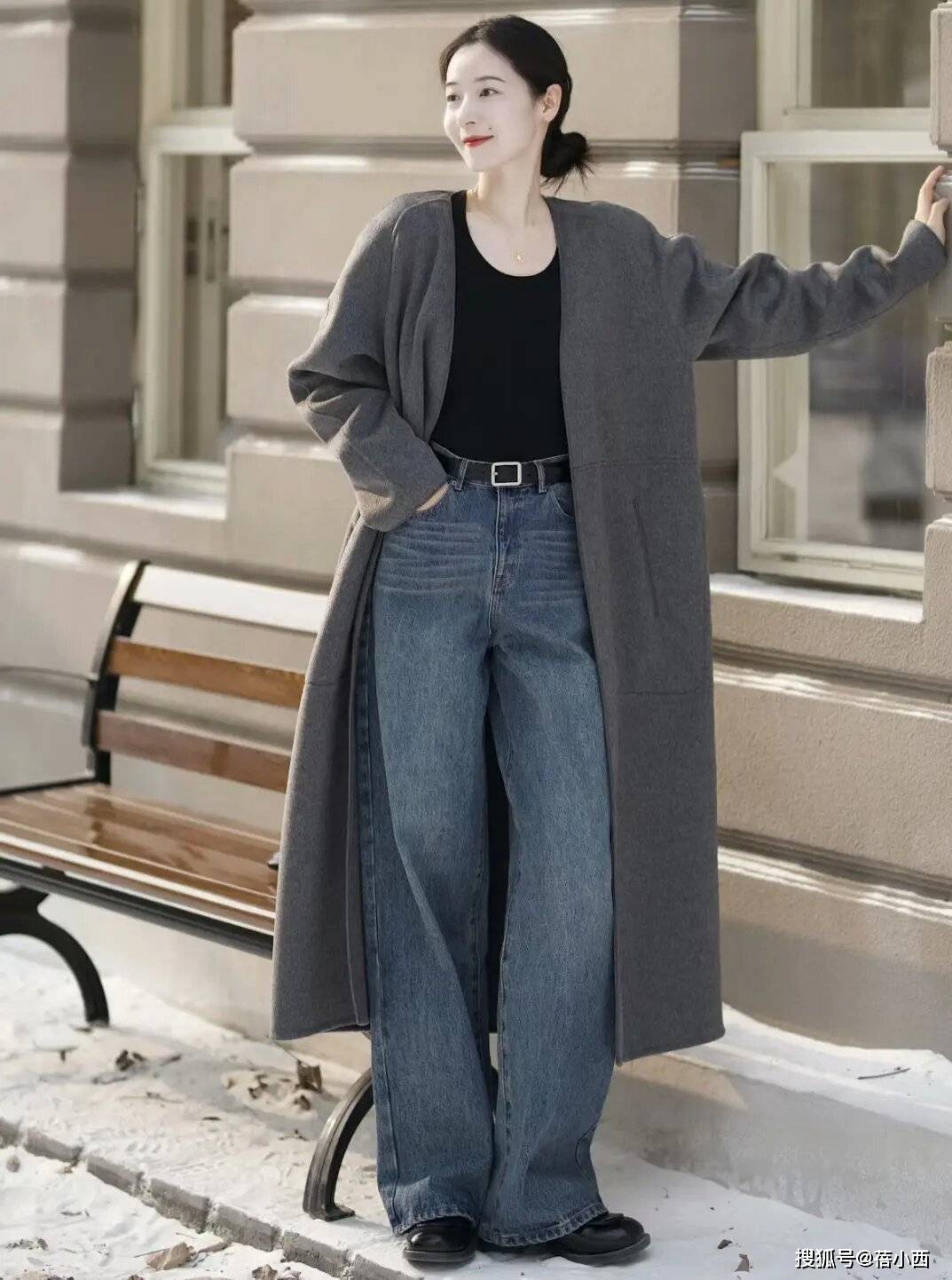 也许,最能够表现气质的,是那一件深灰色的大衣。敞开穿着,尽显潇洒。内搭一件简单的黑色打底衫,再加上一条高腰牛仔阔腿裤,层次感分明,比例匀称,整个人的气质顿时跃然而出。特别适合那些高挑的女性,她们穿上这样的搭配,气场十足,又不失休闲感。